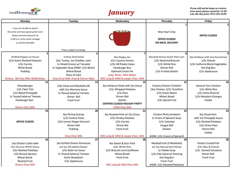 *** Reminder Home-Delivered Meal Consumers if you are not going to be home for a day of delivery, please call our office by 11am the day before to place your meal on hold.